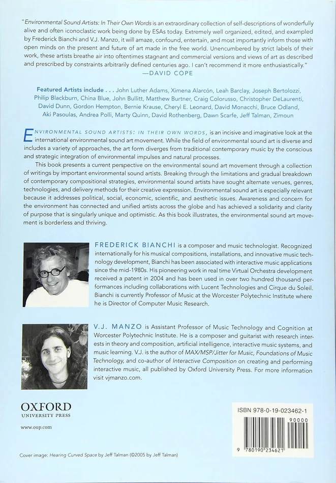 is an incisive and imaginative look at the international environmental sound art movement, which emerged in the late 1960s. The term environmental sound art is generally applied to the work of sound artists who incorporate processes in which the artist actively engages with the environment. While the field of environmental sound art is diverse and includes a variety of approaches, the art form diverges from traditional contemporary music by the conscious and strategic integration of environmental impulses and natural processes.