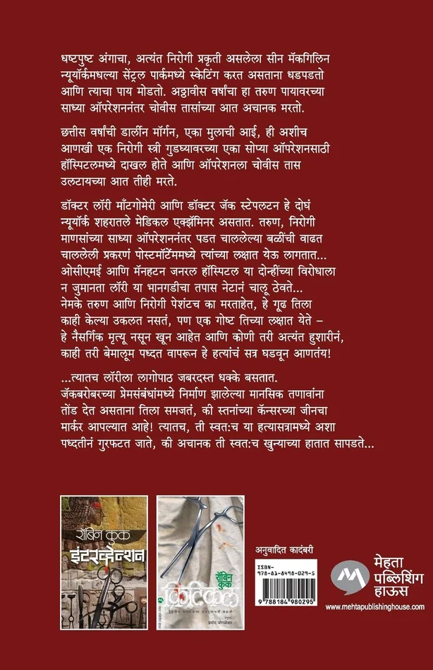THE MASTER OF THE MEDICAL THRILLER RETURNS WITH HIS MOST HEART-POUNDING TALE YET. TWENTY-EIGHT-YEAR-OLD SEAN MCGILLIN IS THE PICTURE OF HEALTH, UNTIL HE FRACTURES HIS LEG WHILE IN-LINE SKATING IN NEW YORK CITY`S CENTRAL PARK. WITHIN TWENTY-FOUR HOURS OF HIS SURGERY, HE DIES. A THIRTY-SIX-YEAR-OLD MOTHER, DARLENE MORGAN, HAS SURGERY TO REPAIR A TORN LIGAMENT IN HER KNEE. AND WITHIN TWENTY-FOUR HOURS, SHE IS DEAD. NEW YORK CITY MEDICAL EXAMINERS DR. LAURIE MONTGOMERY AND DR. JACK STAPLETON ARE BACK, IN ROBIN COOK`S ELECTRIFYING TWENTY-FIFTH NOVEL. LAST SEEN IN VECTOR, THE DOCTORS NOW CONFRONT A BALLOONING SERIES OF PUZZLING HOSPITAL DEATHS OF YOUNG, HEALTHY PEOPLE WHO HAVE JUST UNDERGONE SUCCESSFUL ROUTINE SURGERY. DESPITE INSTITUTIONAL RESISTANCE FROM HER SUPERIORS, AND FROM THE STAFF AT MANHATTAN GENERAL, LAURIE DOGGEDLY PURSUES THE INVESTIGATION AS THE DEATH TOLL MOUNTS. IT SEEMS IMPOSSIBLE TO DETERMINE WHY AND HOW THE PATIENTS ARE DYING, YET SHE COMES TO SUSPECT THAT NOT ONLY ARE THE DEATHS RELATED THEY`RE INTENTIONAL, SUGGESTING THE WORK OF A REMARKABLY CLEVER HEALTHCARE SERIAL KILLER WITH A VERY UNUSUAL MOTIVE, WHICH MAY INVOLVE FRIGHTENING TIES TO BOTH DEVELOPING GENOMIC MEDICINE AND THE ECONOMICS OF MODERN-DAY HEALTHCARE. AS IF TO HEIGHTEN THE TENSION, LAURIE IS DEALT A DOUBLE BLOW: WHILE COPING WITH JACK`S INABILITY TO COMMIT TO THEIR RELATIONSHIP, SHE DISCOVERS SHE CARRIES A GENETIC MARKER FOR A BREAST-CANCER GENE. WITH HER PERSONAL LIFE UNRAVELING, THE NEED FOR ANSWERS BECOMES MORE URGENT, ESPECIALLY WHEN SHE IS INEXORABLY PULLED INTO THE NIGHTMARE AS A POSSIBLE VICTIM HERSELF. TIME WINDS DOWN, AND LAURIE AND JACK MUST RACE TO CONNECT THE DOTS-AND SAVE HER LIFE. WITH HIS SIGNATURE BLEND OF SUSPENSE AND SCIENCE, ROBIN COOK DELIVERS AN ELECTRIFYING PAGE-TURNER AS VIVID AS TODAY`S HEADLINES. DR. ROBIN COOK IS CURRENTLY ON LEAVE FROM THE MASSACHUSETTS EYE AND EAR INFIRMARY. HE LIVES AND WORKS IN FLORIDA.