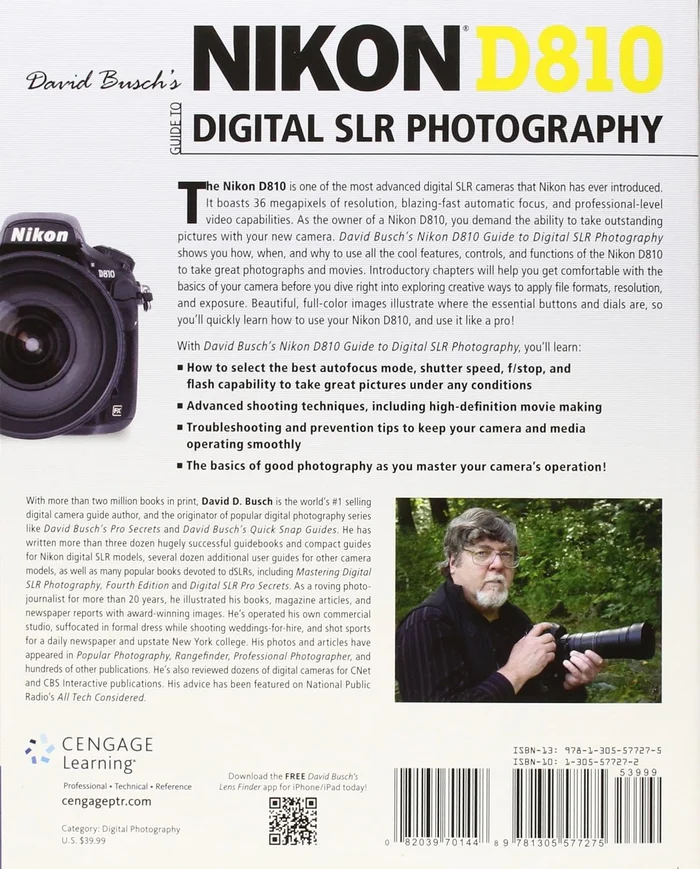 DAVID BUSCH’S NIKON D810 GUIDE TO DIGITAL SLR PHOTOGRAPHY is a complete resource and reference for the Nikon D810, the new 36 megapixel model featuring a new sensor, extra movie options, and faster focus/operation. With this book in hand, you will explore the world of digital photography, develop your creativity, and take great photographs with the Nikon D810. With clear how-to steps and full-color illustrations, DAVID BUSCH’S NIKON D810 GUIDE TO DIGITAL SLR PHOTOGRAPHY covers your camera’s features in depth, from taking your first photos through advanced details of setup, exposure, lenses, lighting, and more, and relates each feature to specific photographic techniques and situations. Also included is the handy Nikon D810 “roadmap,” an easy-to-use visual guide to the camera’s features and controls. With David Busch as your guide, you’ll be in full creative control, whether you’re shooting on the job, as an advanced hobbyist, or are just out for fun. Start building your knowledge, creativity, and confidence with the Nikon D810 today.