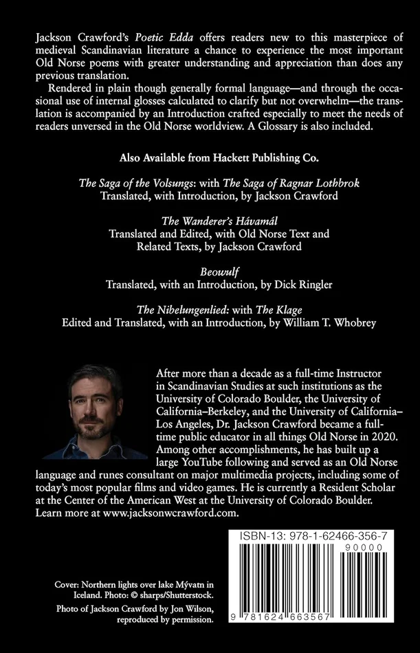 have waited a long time for a Modern English translation that would do them justice. Here it is at last (Odin be praised!) and well worth the wait. These amazing texts from a 13th-century Icelandic manuscript are of huge historical, mythological and literary importance, containing the lion’s share of information that survives today about the gods and heroes of pre-Christian Scandinavians, their unique vision of the beginning and end of the world, etc. Jackson Crawford’s modern versions of these poems are authoritative and fluent and often very gripping. With their individual headnotes and complementary general introduction, they supply today’s readers with most of what they need to know in order to understand and appreciate the beliefs, motivations, and values of the Vikings.”