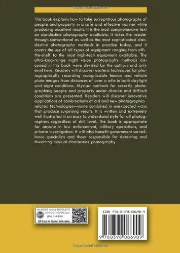 This book explains how to take surreptitious photographs and record video of people and property in a safe and effective manner while producing excellent results. It is the most comprehensive text on clandestine photography available. It takes the reader through conventional as well as the most sophisticated clandestine photography methods in practice today, and it covers the use of all types of equipment ranging from off-the-shelf to the most high-tech equipment available. The ultra-long-range night vision photography methods discussed in this book were devised by the authors and only exist here. Readers will discover esoteric techniques for photographically recording recognizable human and vehicle plate images from distances of over a mile in both daylight and night conditions. Myriad methods for secretly photographing people and property under diverse and difficult conditions are presented. Readers will discover innovative applications of combinations of old and new photographic-related technologies some combined in unexpected ways that produce surprising results. It is written and extremely well illustrated in an easy to understand style for all photographers regardless of skill level. The book is appropriate for anyone in law enforcement, military operations, and private investigation. It will also benefit government surveillance specialists and those responsible for detecting and thwarting manual clandestine photography.