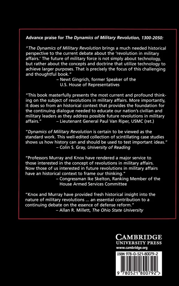 The Dynamics of Military Revolution bridges a major gap in the emerging literature on revolutions in military affairs. It suggests that two very different phenomena have been at work over the past centuries: “military revolutions,” which are driven by vast social and political changes, and “revolutions in military affairs,” which military institutions have directed, although usually with great difficulty and ambiguous results. MacGregor Knox and Williamson Murray provide a conceptual framework and historical context for understanding the patterns of change, innovation, and adaptation that have marked war in the Western world since the fourteenth century beginning with Edward III’s revolution in medieval warfare, through the development of modern military institutions in seventeenth century France, to the military impact of mass politics in the French Revolution, the cataclysmic military industrial struggle of 1914 1918, and the German Blitzkrieg victories of 1940. Case studies and a conceptual overview offer an indispensible introduction to revolutionary military change, which is as inevitable as it is difficult to predict. Macgregor Knox is the Stevenson Professor of International History at the London School of Economics and Political Science. He is the author of Common Destiny (Cambridge, 2000) and Hitler’s Italian Allies (Cambridge, 2000). Knox and Murray are co editors of Making of Strategy (Cambridge, 1996). Willamson Murray is Senior Fellow at the Institute for Defense Analysis. He is the co editor of Military Innovation in the Interwar Period (Cambridge, 1996) and author of A War to Be Won (Harvard University Press, 2000).