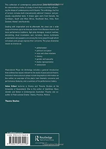 This collection of contemporary postcolonial plays demonstrates the extraordinary vitality of a body of work that is currently influencing the shape of contemporary world theatre. This anthology encompasses both internationally admired ‘classics’ and previously unpublished texts, all dealing with imperialism and its aftermath. It includes work from Canada, the Carribean, South and West Africa, Southeast Asia, India, New Zealand and Australia. A general introduction outlines major themes in postcolonial plays. Introductions to individual plays include information on authors as well as overviews of cultural contexts, major ideas and performance history. Dramaturgical techniques in the plays draw on Western theatre as well as local performance traditions and include agit-prop dialogue, musical routines, storytelling, ritual incantation, epic narration, dance, multimedia presentation and puppetry. The plays dramatize diverse issues, such as: *globalization * political corruption * race and class relations *slavery *gender and sexuality *media representation *nationalism