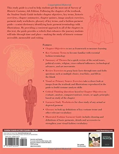 includes chapter objectives, key terms, historic overviews, chapter summaries, chapter quizzes, image-analysis exercises, garment analysis worksheets, glossary of key terms, and a fashion garment guide-a mini-dictionary identifying basic garment terminology with illustrations. By providing a consistent approach to all of the chapters in this text, the guide provides a vehicle that enhances the journey students will take through time and place-making the study of historic costume accessible, memorable and exiting.