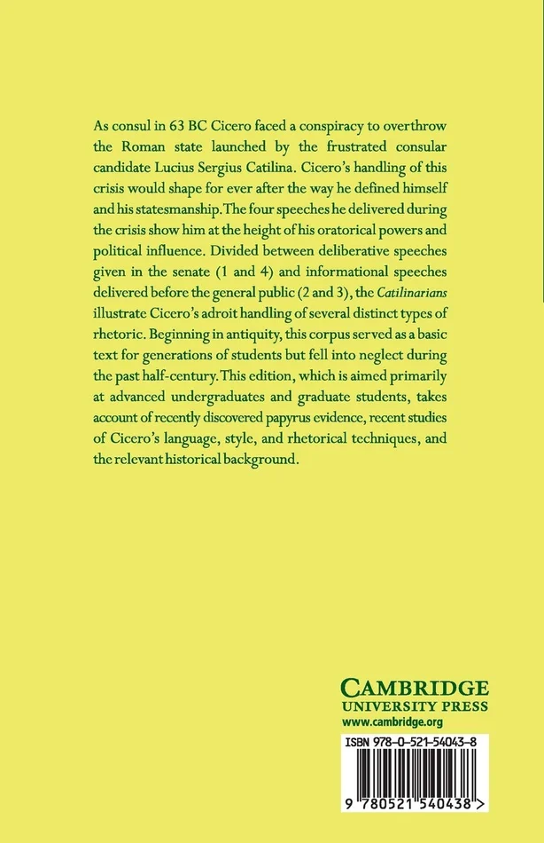 As consul in 63 BC Cicero faced a conspiracy to overthrow the Roman state launched by the frustrated consular candidate Lucius Sergius Catilina. Cicero’s handling of this crisis would shape foreverafter the way he defined himself and his statesmanship. The four speeches he delivered during the crisis show him at the height of his oratorical powers and political influence. Divided between deliberative speeches given in the senate (1 and 4) and informational speeches delivered before the general public (2 and 3), the Catilinarians illustrate Cicero’s adroit handling of several distinct types of rhetoric. Beginning in antiquity, this corpus served as a basic text for generations of students but fell into neglect during the past half-century. This edition, which is aimed primarily at advanced undergraduates and graduate students, takes account of recently discovered papyrus evidence, recent studies of Cicero’s language, style and rhetorical techniques, and the relevant historical background.