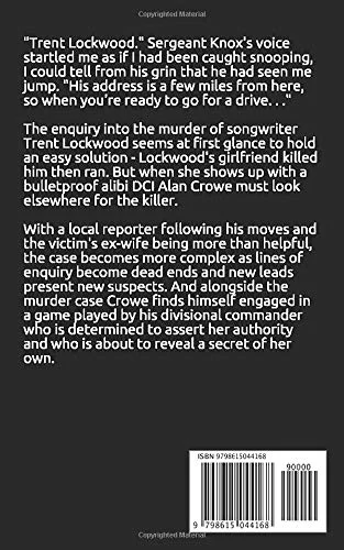 “Trent Lockwood.”Sergeant Knox’s voice startled me as if I had been caught snooping, I could tell from his grin that he had seen me jump. “His address is a few miles from here, so when you’re ready to go for a drive. . .” The enquiry into the murder of songwriter Trent Lockwood seems at first glance to hold an easy solution – Lockwood’s girlfriend killed him then ran. But when she shows up with a bulletproof alibi Dci Alan Crowe must look elsewhere for the killer. With a local reporter following his moves and the victim’s ex-wife being more than helpful, the case becomes more complex as lines of enquiry become dead ends and new leads present new suspects. And alongside the murder case Crowe finds himself engaged in a game played by his divisional commander who is determined to assert her authority and who is about to reveal a secret of her own.