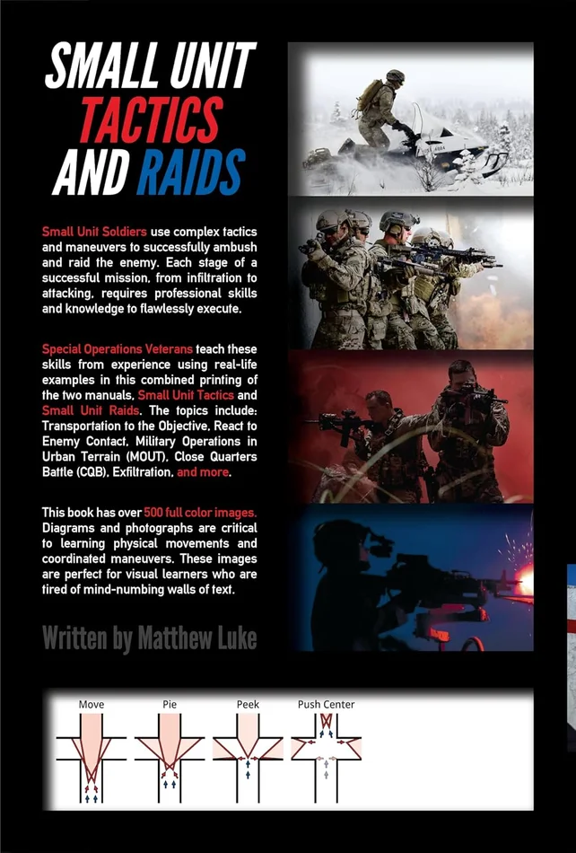 teach these skills from experience using real-life examples in this combined printing of the two manuals, Small Unit Tactics and Small Unit Raids. The topics include: Transportation to the Objective, React to Enemy Contact, Military Operations in Urban Terrain (MOUT), Close Quarters Battle (CQB), Exfiltration, and more.