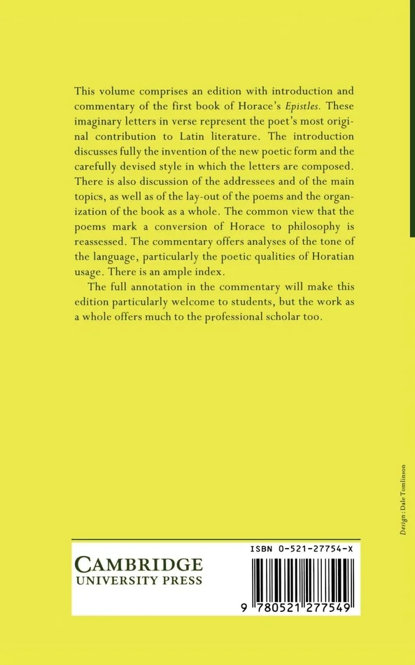 This volume comprises an edition, with introduction and commentary, of the first book of Horace’s Epistles. These are imaginary letters in verse, and represent the Roman poet’s most original contribution to Latin literature. The introduction discusses poetic form and style, the addressees of the letters and the main topics, as well as the layout of the poems and their organization within Book I. The commentary gives ample help with the language, paying particular attention to its poetic qualities.