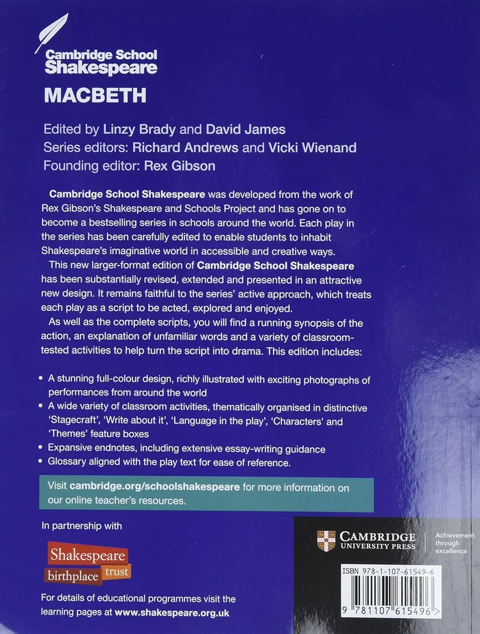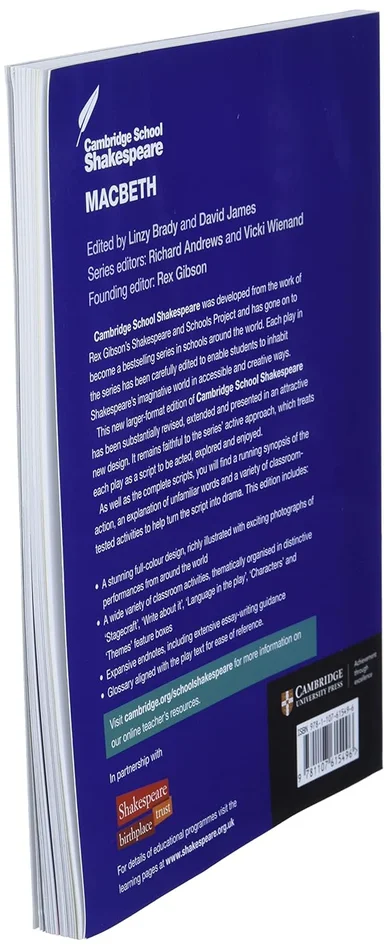 An improved, larger-format edition of the Cambridge School Shakespeare plays, extensively rewritten, expanded and produced in an attractive new design. An active approach to classroom Shakespeare enables students to inhabit Shakespeare’s imaginative world in accessible and creative ways. Students are encouraged to share Shakespeare’s love of language, interest in character and sense of theatre.Substantially revised and extended in full colour, classroom activities are thematically organised in distinctive ‘Stagecraft’, ‘Write about it’, ‘Language in the play’, ‘Characters’ and ‘Themes’ features. Extended glossaries are aligned with the play text for easy reference. Expanded endnotes include extensive essay-writing guidance for ‘Macbeth’ and Shakespeare.Includes rich, exciting colour photos of performances of ‘Macbeth’ from around the world.