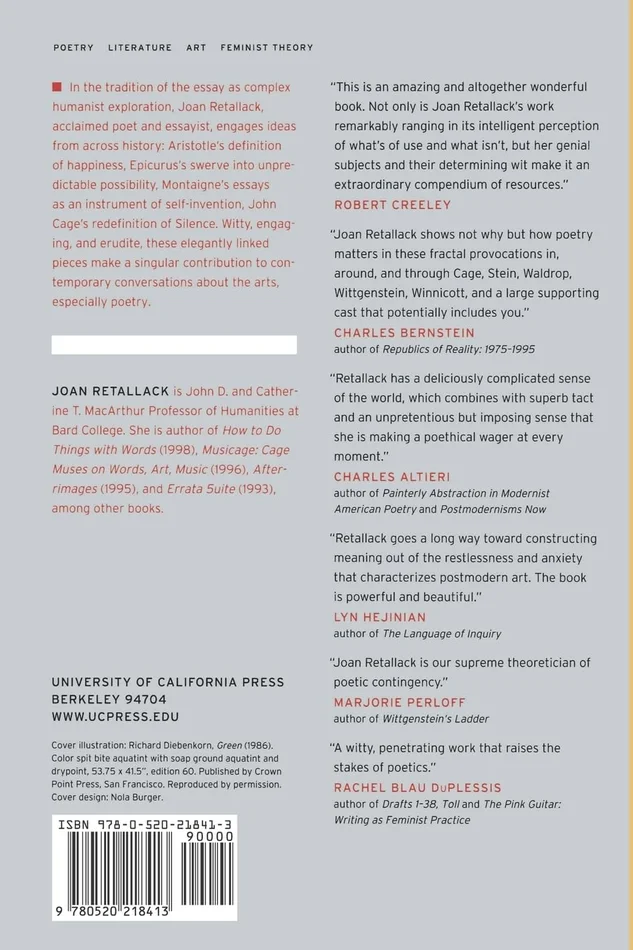 In these highly inventive essays, Joan Retallack, acclaimed poet and essayist, conveys her unique post-utopian vision as she explores the relationship between art and life in today’s chaotic world. In the tradition of the essay as complex humanist exploration, she engages ideas from across history: Aristotle’s definition of happiness, Epicurus’s swerve into unpredictable possibility, Montaigne’s essays as an instrument of self-invention, John Cage’s redefinition of Silence. Within her unifying rubric of poethics, Retallack gives the reader plenty of surprises with a wonderful range of examples, situations, and texts through which she conducts her exploration. A computer glitch, a passage from Gertrude Stein’s favorite detective novelist, the idea of the experimental feminine, a John Cage performance求all serve as occasions for inquiry and speculation on the way to her poethics of a “complex realism.”