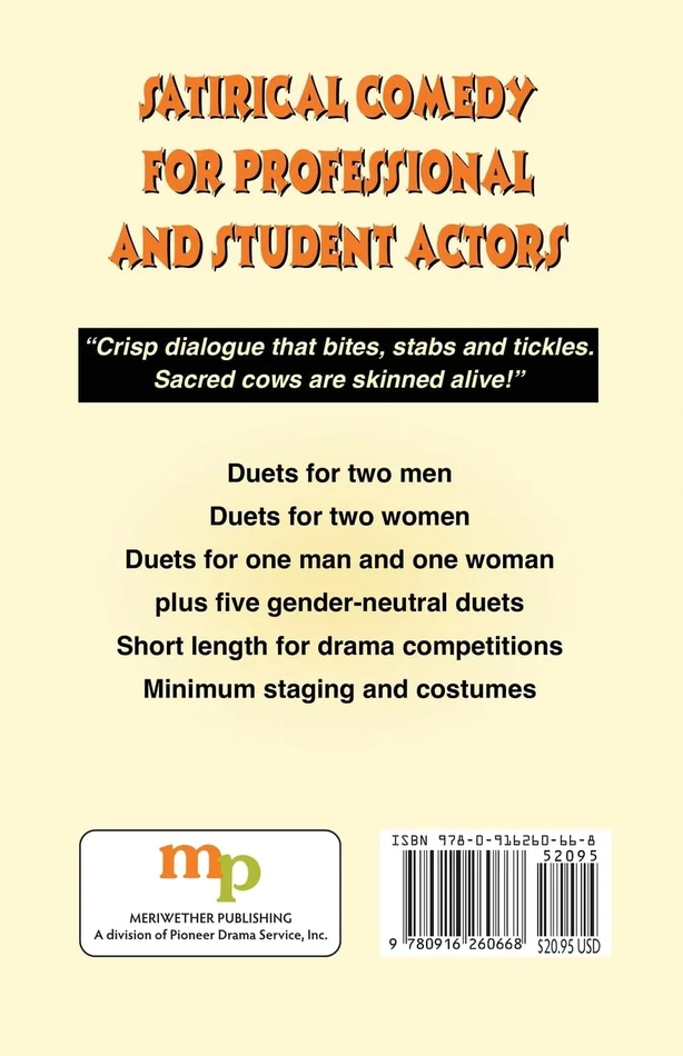 Concise, intelligent, and very funny! These professional-level satirical duet scenes are perfect for drama competitions, a night of entertainment, or acting practice. Exaggerated characters and absurd situations from comedy writer Bill Majeski will have both audiences and actors in hysterics! Choose from fifty comedy duets that are organized into categories for two men, two women, or one man and one woman. Each scene has simple staging, with little need for costumes or props. These royalty-free scenes provide a perfect way to practice important comedic skills like timing, characterization, and physical comedy. If you enjoyed the author’s comedic monologues in 50 Great Monologues, you’re sure to love this laugh-out-loud book of scenes for two actors!