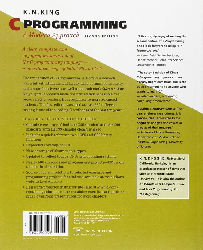 Professor King’s spiral approach made it accessible to a broad range of readers, from beginners to more advanced students. With adoptions at over 225 colleges, the first edition was one of the leading C textbooks of the last ten years. The second edition maintains all the book’s popular features and brings it up to date with coverage of the C99 standard. The new edition also adds a significant number of exercises and longer programming projects, and includes extensive revisions and updates.
