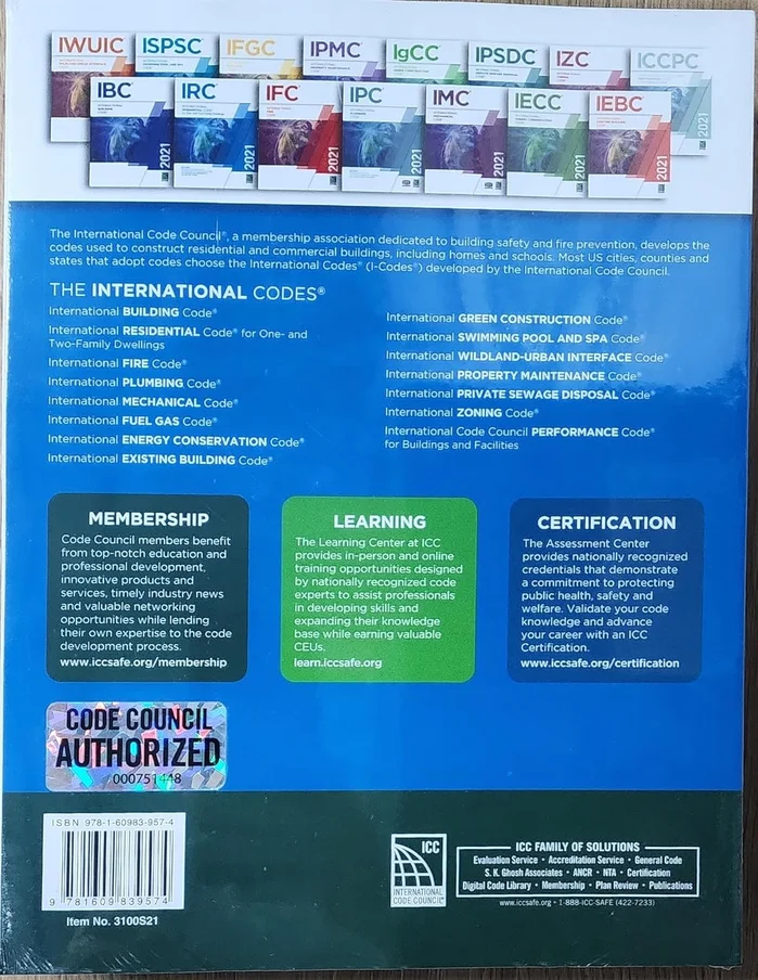 This comprehensive code comprises all building, plumbing, mechanical, fuel gas and electrical requirements for one- and two-family dwellings and townhouses up to three stories. The 2021 IRC contains many important changes such as: Braced wall lines must be placed on a physical wall or placed between multiple walls. The rated separation for two-family dwellings is 1 hour whether or not a lot line exists between units. Emergency escape and rescue openings require a clear 36-inch-wide path to a public way. An engineered design is required for storm shelters. A habitable attic is limited to one-half the area of the story below and the dwelling requires sprinklers. Updated Wind Speed maps match IBC and ASCE 7 maps. Deck design now considers snow load, tributary area for footing and post height, and guard details. Specific requirements for deck guardrails were added. Component and cladding wind pressures in Table R301.2(2) are updated for new design wind speeds and hip or gable roof profiles. Minimum footing size tables are revised to more accurately reflect current practice. Cripple wall requirements apply only to exterior cripple walls. New appendices for cob construction and 3D printed construction are added. A 30 percent reduction of airflow is permitted for balanced ventilation systems. Commercial gas cooking appliances are prohibited. The head pressure for a water test of DWV systems increased to 10 feet. Air vacuum testing is now permitted for plastic piping DWV systems. Section P2904 for dwelling sprinklers is expanded to more closely align with NFPA 13D. An emergency service disconnect is required in a readily accessible outdoor location. A surge-protective device (SPD) is now required at the service panel. The number of receptacle outlets required for peninsular and island countertops in kitchens is determined by the area of the countertop surface.