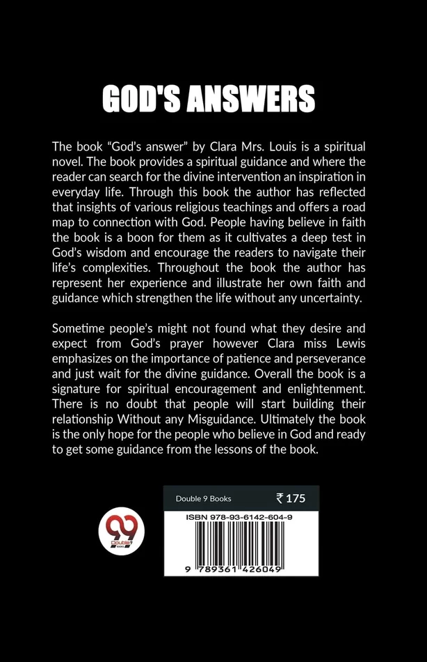 The book “God’s answer” by Clara Mrs. Louis is a spiritual novel. The book provides a spiritual guidance and where the reader can search for the divine intervention an inspiration in everyday life. Through this book the author has reflected that insights of various religious teachings and offers a road map to connection with God. People having believe in faith the book is a boon for them as it cultivates a deep test in God’s wisdom and encourage the readers to navigate their life’s complexities. Throughout the book the author has represent her experience and illustrate her own faith and guidance which strengthen the life without any uncertainty. Sometime people’s might not found what they desire and expect from God’s prayer however Clara miss Lewis emphasizes on the importance of patience and perseverance and just wait for the divine guidance. Overall the book is a signature for spiritual encouragement and enlightenment. There is no doubt that people will start building their relationship Without any Misguidance. Ultimately the book is the only hope for the people who believe in God and ready to get some guidance from the lessons of the book.