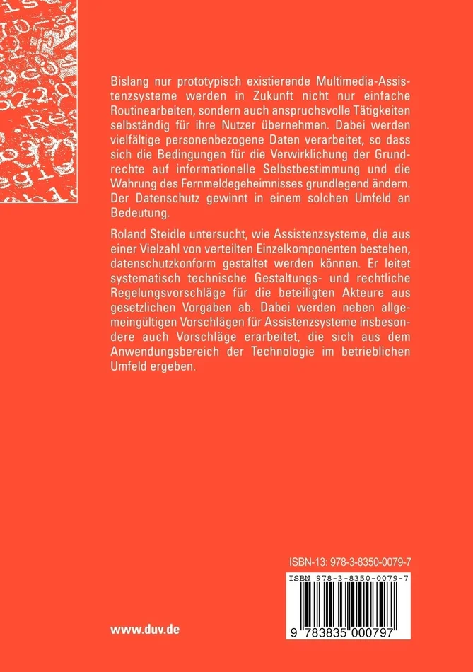 Roland Steidle untersucht, wie Assistenzsysteme, die aus einer Vielzahl von verteilten Einzelkomponenten bestehen, datenschutzkonform gestaltet werden k?nnen. Er leitet systematisch technische Gestaltungs- und rechtliche Regelungsvorschl?ge f邦r die beteiligten Akteure aus gesetzlichen Vorgaben ab. Dabei werden neben allgemeing邦ltigen Vorschl?gen f邦r Assistenzsysteme insbesondere auch Vorschl?ge erarbeitet, die sich aus dem Anwendungsbereich der Technologie im betrieblichen Umfeld ergeben.