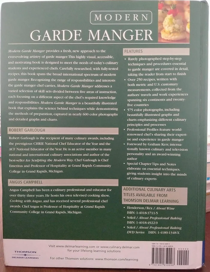 The Modern Garde Manger is a meticulously organized textbook designed to meet the educational needs of novice culinary students. Its carefully researched information and fully-tested recipes span the broad international spectrum of the modern garde manger station. Five distinct sections covering seventeen chapters of text and recipes focus on the different aspects of the chef’s required knowledge and responsibilities. These sections provide detailed information on the foundations in garde manger, the preparation and fabrications skills of the garde manger, preserved foods of the garde manger, and displayed arts of the garde manger. Special features of the text include Chapter Goals; Professional Profiles featuring leading culinary personalities; Review Questions to spark classroom discussion and pique student interest; Activities and Applications that stress the importance of critical thinking skills, relative to the material presented in the chapter; and Key Words in Review, which reinforce key concepts presented in the text .With over 500 color photographs, 250 recipes, and 75 beautifully illustrated graphs and charts, The Modern Garde Manger is the most educationally comprehensive text written for today’s culinary classroom.