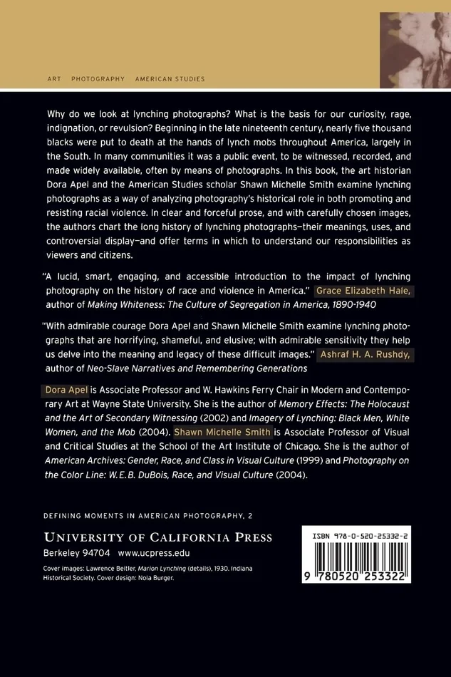 Why do we look at lynching photographs? What is the basis for our curiosity, rage, indignation, or revulsion? Beginning in the late nineteenth century, nearly five thousand blacks were put to death at the hands of lynch mobs throughout America. In many communities it was a public event, to be witnessed, recorded, and made available by means of photographs. In this book, the art historian Dora Apel and the American Studies scholar Shawn Michelle Smith examine lynching photographs as a way of analyzing photography’s historical role in promoting and resisting racial violence. They further suggest how these photographs continue to affect the politics of spectatorship. In clear prose, and with carefully chosen images, the authors chart the history of lynching photographs求their meanings, uses, and controversial display求and offer terms in which to understand our responsibilities as viewers and citizens.