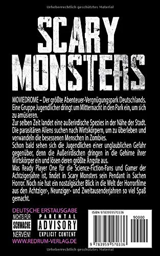 Zum Buch:MOVIEDROME 每 Der gr??te Abenteuer-Vergn邦gungspark Deutschlands.Eine Gruppe Jugendlicher dringt um Mitternacht in den Park ein, um sich zu am邦sieren.Zur selben Zeit landet eine au?erirdische Spezies in der N?he der Stadt. Die parasit?ren Aliens suchen nach Wirtsk?rpern, um zu 邦berleben und verwandeln die besessenen Menschen in Zombies.Schon bald sehen sich die Jugendlichen einer unglaublichen Gefahr gegen邦ber, denn die Au?erirdischen dringen in die Gehirne ihrer Wirtsk?rper ein und l?sen deren gr??te ?ngste aus.Was Ready Player One f邦r die Science-Fiction-Fans und Gamer der Achtzigerjahre ist, findet in Scary Monsters sein Pendant in Sachen Horror. Noch nie hat ein nostalgischer Blick in die Welt der Horrorfilme aus den Achtziger-, Neunziger- und Zweitausenderjahren so viel Spa? gemacht.