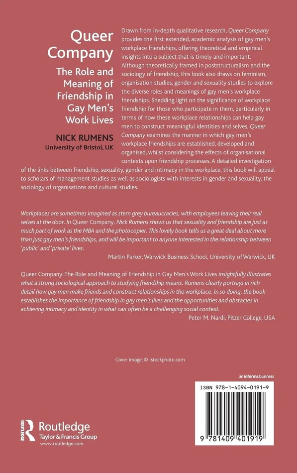 Drawn from in-depth qualitative research, Queer Company provides the first extended, academic analysis of gay men’s workplace friendships, offering theoretical and empirical insights into a subject that is timely and important. Although theoretically framed in poststructuralism and the sociology of friendship, this book also draws on feminism, organisation studies, gender and sexuality studies to explore the diverse roles and meanings of gay men’s workplace friendships. Shedding light on the significance of workplace friendship for those who participate in them, particularly in terms of how these workplace relationships can help gay men to construct meaningful identities and selves, Queer Company examines the manner in which gay men*s workplace friendships are established, developed and organised, whilst considering the effects of organisational contexts upon friendship processes. A detailed investigation of the links between friendship, sexuality, gender and intimacy in the workplace, this book will appeal to scholars of management studies as well as sociologists with interests in gender and sexuality, the sociology of organisations and cultural studies.