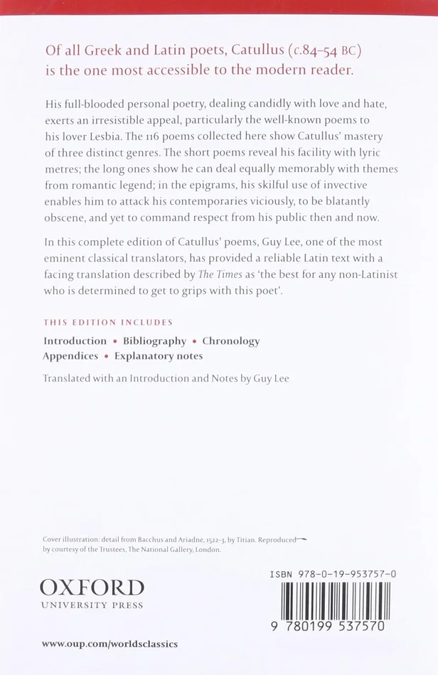 Of all Greek and Latin poets Catullus is perhaps the most accessible to the modern reader. Dealing candidly with the basic human emotions of love and hate, his virile, personal tone exerts a powerful appeal on all kinds of readers. The 116 poems collected in this new translation include the famous Lesbia poems and display the full range of Catullus’s mastery of lyric meter, mythological themes, and epigrammatic invective and wit.