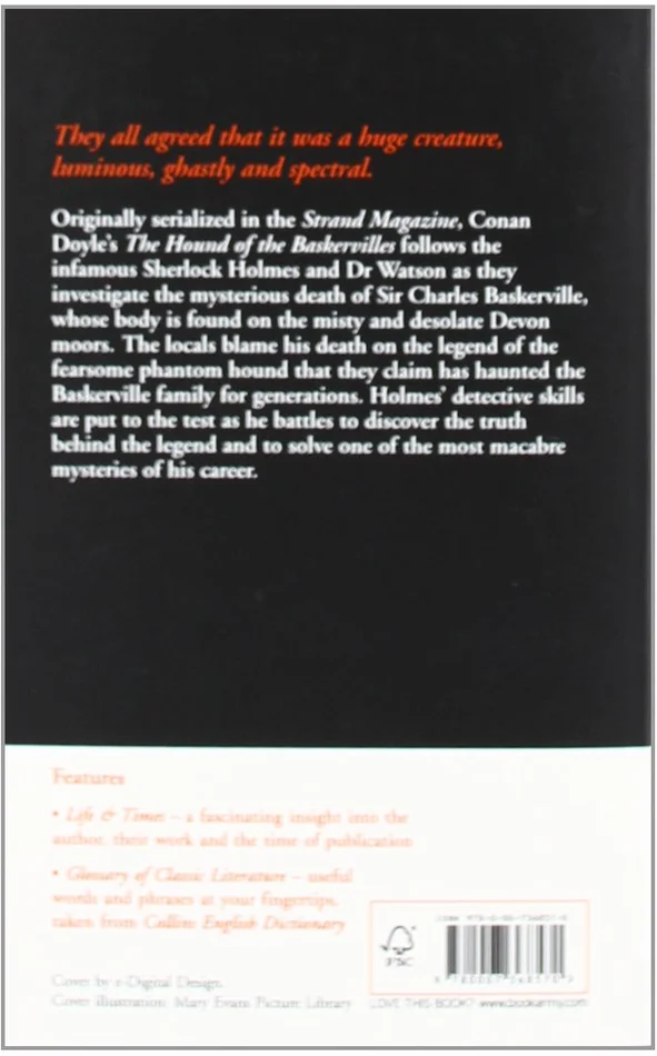 HarperCollins is proud to present its new range of best-loved, essential classics. ‘They all agreed that it was a huge creature, luminous, ghastly and spectral.’ Originally serialised in The Strand Magazine, Conan Doyle’s The Hound of the Baskervilles follows the infamous Sherlock Holmes and Dr Watson as they investigate the mysterious death of Sir Charles Baskerville, whose dead body is found on the misty and desolate Devon moors. The locals blame his death on the legend of the fearsome phantom hound that they claim has haunted the Baskerville family for generations. When the heir to the Baskerville fortune, Sir Henry, also comes under threat Holmes’ detective skills are put to the test as he battles to discover the truth behind the legend and to solve one of the most macabre mysteries of his career.