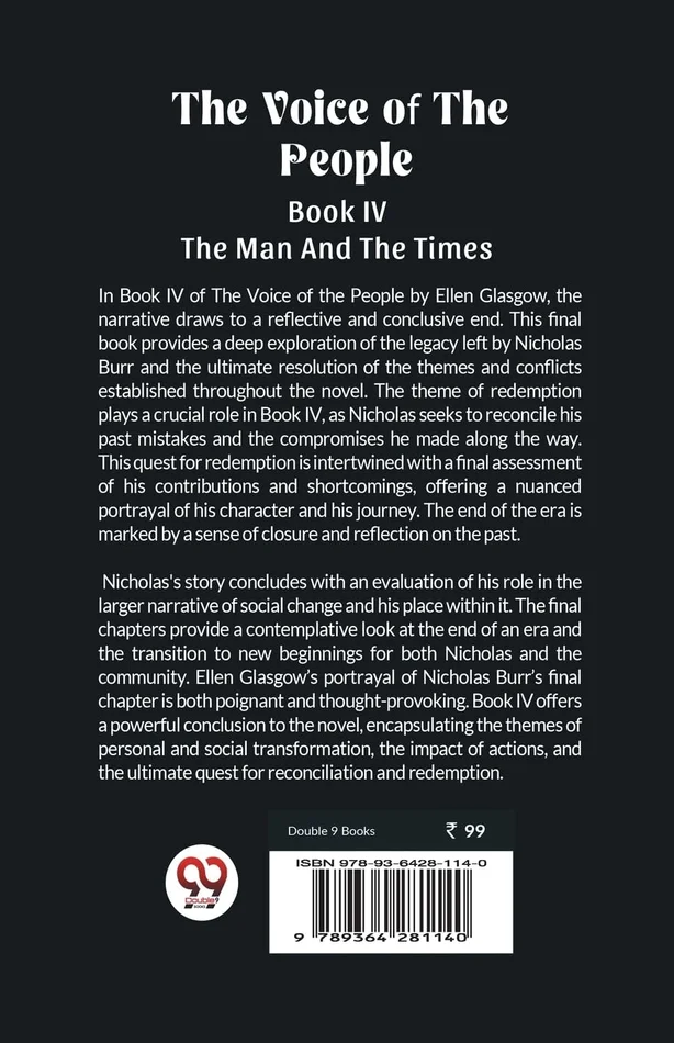 In Book IV of The Voice of the People by Ellen Glasgow, the narrative draws to a reflective and conclusive end. This final book provides a deep exploration of the legacy left by Nicholas Burr and the ultimate resolution of the themes and conflicts established throughout the novel. The theme of redemption plays a crucial role in Book IV, as Nicholas seeks to reconcile his past mistakes and the compromises he made along the way. This quest for redemption is intertwined with a final assessment of his contributions and shortcomings, offering a nuanced portrayal of his character and his journey. The end of the era is marked by a sense of closure and reflection on the past. Nicholas’s story concludes with an evaluation of his role in the larger narrative of social change and his place within it. The final chapters provide a contemplative look at the end of an era and the transition to new beginnings for both Nicholas and the community. Ellen Glasgow’s portrayal of Nicholas Burr’s final chapter is both poignant and thought-provoking. Book IV offers a powerful conclusion to the novel, encapsulating the themes of personal and social transformation, the impact of actions, and the ultimate quest for reconciliation and redemption.