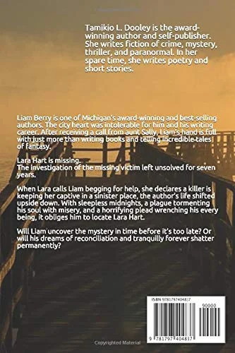 Liam Berry is one of Michigan*s award-winning and best-selling authors. The city heart was intolerable for him and his writing career. After receiving a call from aunt Sally, Liam*s hand is full with just more than writing books and telling incredible tales of fantasy. Lara Hart is missing. The investigation of the missing victim left unsolved for seven years.When Lara calls Liam begging for help, she declares a killer is keeping her captive in a sinister place, the author*s life shifted upside down. With sleepless nights, a plague tormenting his soul with misery, and a horrifying plead wrenching his every being, it obliges him to locate Lara Hart.Will Liam uncover the mystery in time before it*s too late? Or will his dreams of reconciliation and tranquilly forever shatter permanently?