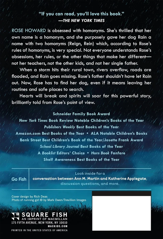 Rose Howard is obsessed with homonyms. She’s thrilled that her own name is a homonym, and she purposely gave her dog Rain a name with two homonyms (Reign, Rein), which, according to Rose’s rules of homonyms, is very special. Not everyone understands Rose’s obsessions, her rules, and the other things that make her different 每 not her teachers, not other kids, and not her single father.