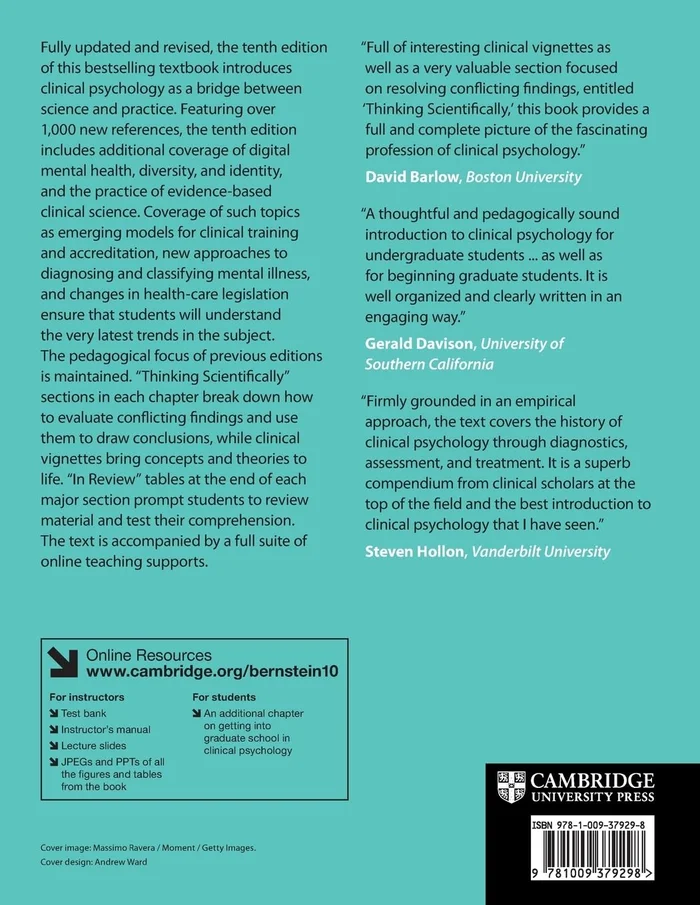 Fully updated and revised, the tenth edition of this bestselling textbook introduces clinical psychology as a bridge between science and practice. Featuring over 1000 new references, the revised text includes additional coverage of digital mental health, diversity, and identity, and the practice of evidence-based clinical science. Coverage of such topics as emerging models for clinical training and accreditation, new approaches to diagnosing and classifying mental illness, and changes in healthcare legislation ensure that students will understand the very latest trends in the subject. The pedagogical focus of previous editions is maintained. ‘Thinking Scientifically’ sections in each chapter break down how to evaluate conflicting findings and use them to draw conclusions, while clinical vignettes bring concepts and theories to life. ‘In Review’ tables at the end of each major section prompt students to review material and test their comprehension. The text is accompanied by a full suite of online teaching supports.