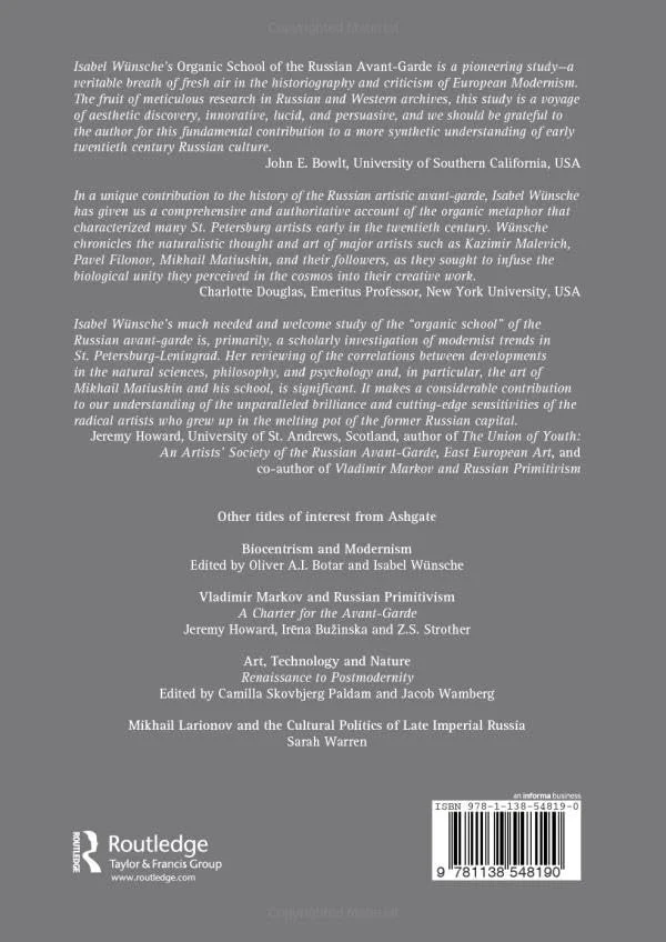 The artists of the Organic School of the Russian avant-garde found inspiration as well as a model for artistic growth in the creative principles of nature. Isabel W邦nsche analyzes the artistic influences, intellectual foundations, and scientific publications that shaped the formation of these artists, the majority of whom were based in St. Petersburg. Particular emphasis is given to the holistic worldviews and organic approaches prevalent among artists of the pre-revolutionary avant-garde, specifically Jan Ci?gli里ski, Nikolai Kulbin, and Elena Guro, as well as the emergence of the concept of Organic Culture as developed by Mikhail Matiushin, practiced at the State Institute of Artistic Culture, and taught at the reformed Art Academy in the 1920s. Discussions of faktura and creative intuition explore the biocentric approaches that dominated the work of Pavel Filonov, Kazimir Malevich, Voldemar Matvejs, Olga Rozanova, and Vladimir Tatlin. The artistic approaches of the Organic School of the Russian avant-garde were further promoted and developed by Vladimir Sterligov and his followers between 1960 and 1990. The study examines the cultural potential as well as the utopian dimension of the artists* approaches to creativity and their ambitious visions for the role of art in promoting human psychophysiological development and shaping post-revolutionary culture.