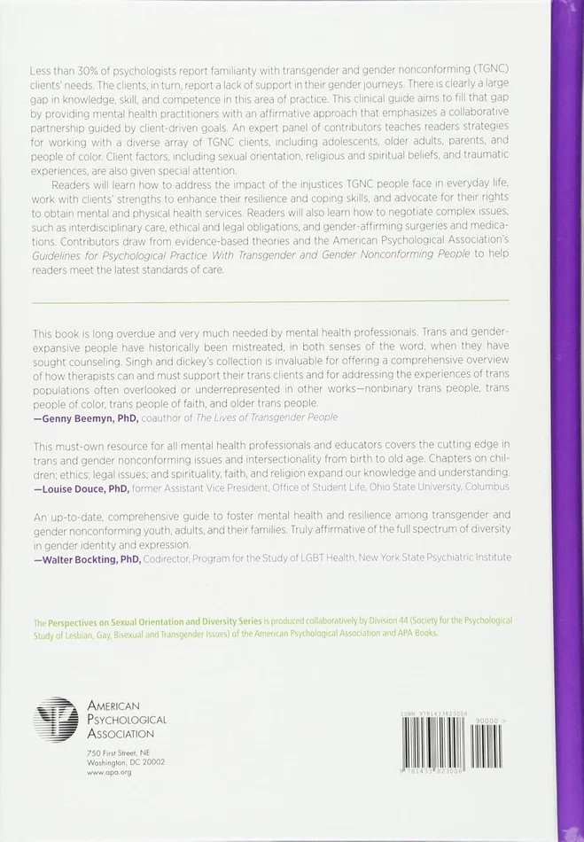 Readers will learn how to address the impact of the injustices TGNC people face in everyday life, work with clients’ strengths to enhance their resilience and coping skills, and advocate for their rights to obtain mental and physical health services. Readers will also learn how to negotiate complex issues, such as interdisciplinary care, ethical and legal obligations, and gender-affirming surgeries and medications. Contributors draw from evidence-based theories and APA’s