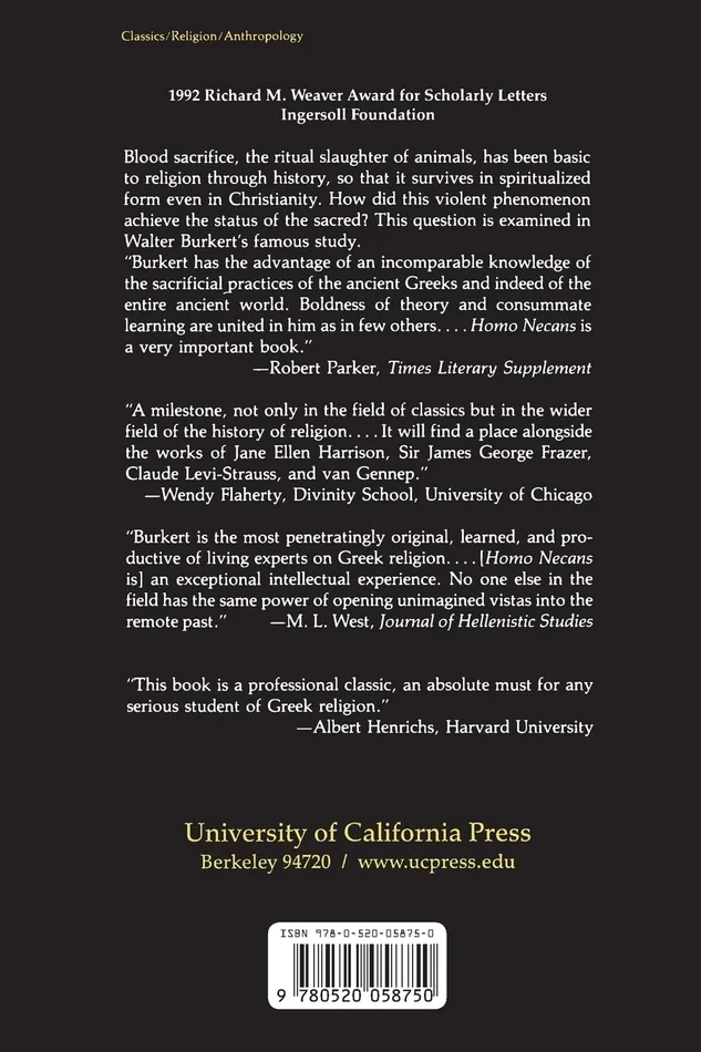 Blood sacrifice, the ritual slaughter of animals, has been basic to religion through history, so that it survives in spiritualized form even in Christianity. How did this violent phenomenon achieve the status of the sacred? This question is examined in Walter Burkert’s famous study.