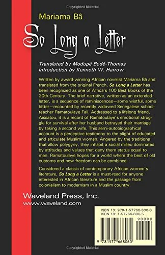 has been recognized as one of Africa’s 100 Best Books of the 20th Century. The brief narrative, written as an extended letter, is a sequence of reminiscences〞some wistful, some bitter〞recounted by recently widowed Senegalese schoolteacher Ramatoulaye Fall. Addressed to a lifelong friend, Aissatou, it is a record of Ramatoulaye’s emotional struggle for survival after her husband betrayed their marriage by taking a second wife. This semi-autobiographical account is a perceptive testimony to the plight of educated and articulate Muslim women. Angered by the traditions that allow polygyny, they inhabit a social milieu dominated by attitudes and values that deny them status equal to men. Ramatoulaye hopes for a world where the best of old customs and new freedom can be combined.