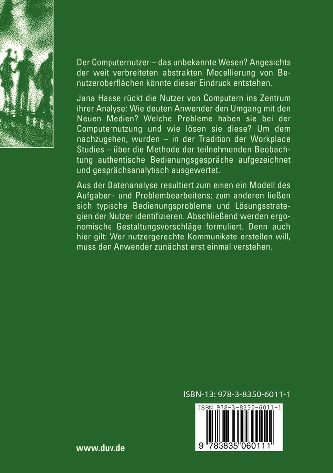 Jana Haase r邦ckt die Nutzer von Computern ins Zentrum ihrer Analyse: Wie deuten Anwender den Umgang mit den Neuen Medien? Welche Probleme haben sie bei der Computernutzung und wie l?sen sie diese? Um dem nachzugehen, wurden – in der Tradition der Workplace Studies – 邦ber die Methode der teilnehmenden Beobachtung authentische Bedienungsgespr?che aufgezeichnet und gespr?chsanalytisch ausgewertet.