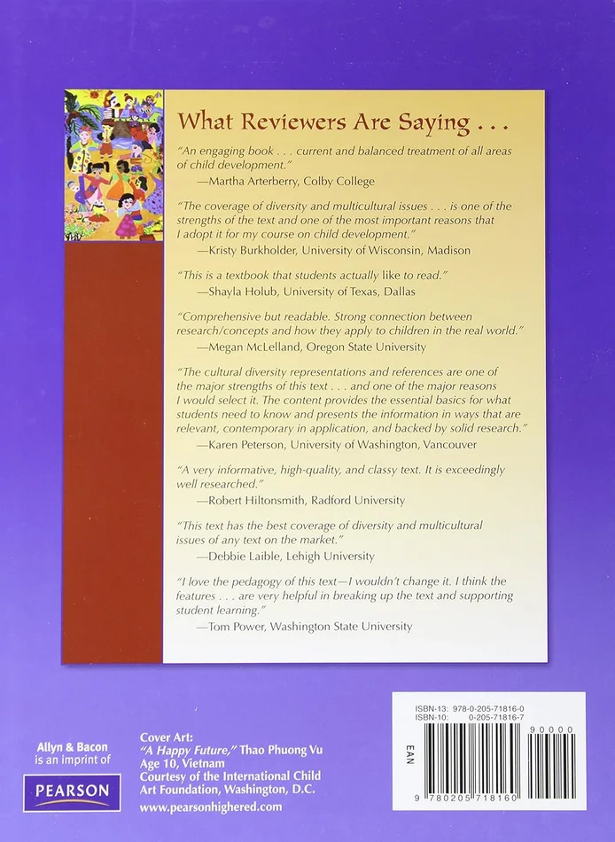 Berk*s signature storytelling style invites students to actively learn beside the text*s ※characters§ who share their influential experiences and developmental milestones. Students are provided with an exceptionally clear and coherent understanding of child development, emphasizing the interrelatedness of all domains〞physical, cognitive, emotional, and social〞throughout the text narrative and in special features. Focusing on education and social policy as critical pieces of the dynamic system in which the child develops, Berk pays meticulous attention to the most recent scholarship in the field. Berk helps students connect their learning to their personal and professional areas of interest and their future pursuits as parents, educators, heath care providers, counselors, social workers, and researchers.