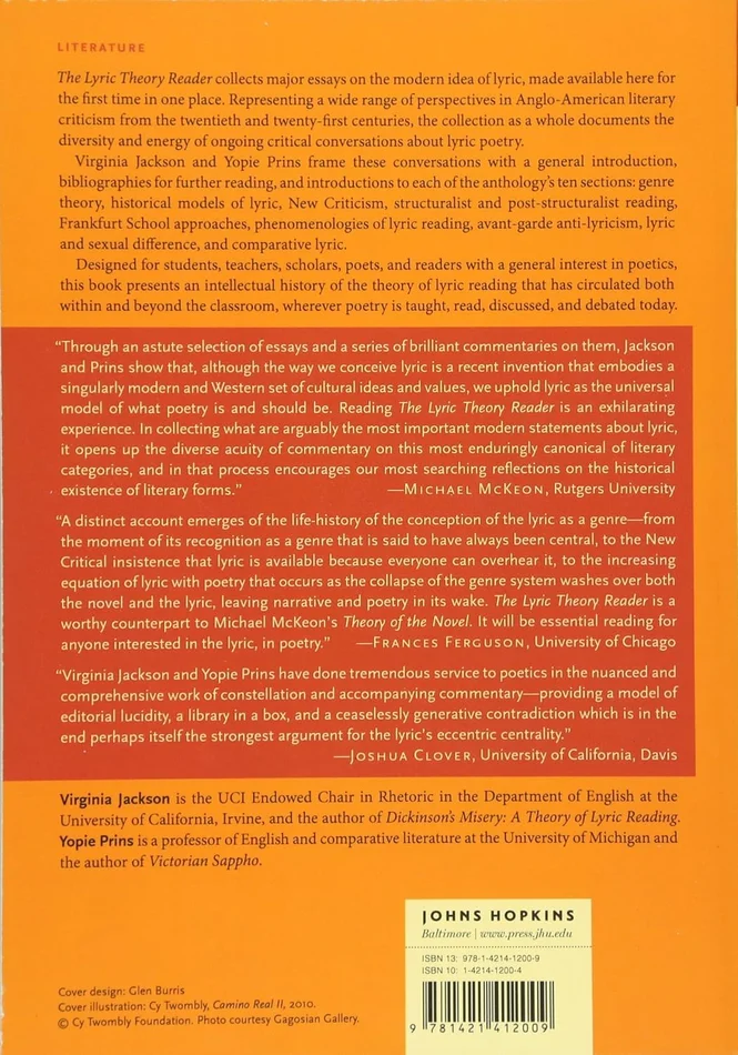 Virginia Jackson and Yopie Prins frame these conversations with a general introduction, bibliographies for further reading, and introductions to each of the anthology*s ten sections: genre theory, historical models of lyric, New Criticism, structuralist and post-structuralist reading, Frankfurt School approaches, phenomenologies of lyric reading, avant-garde anti-lyricism, lyric and sexual difference, and comparative lyric.