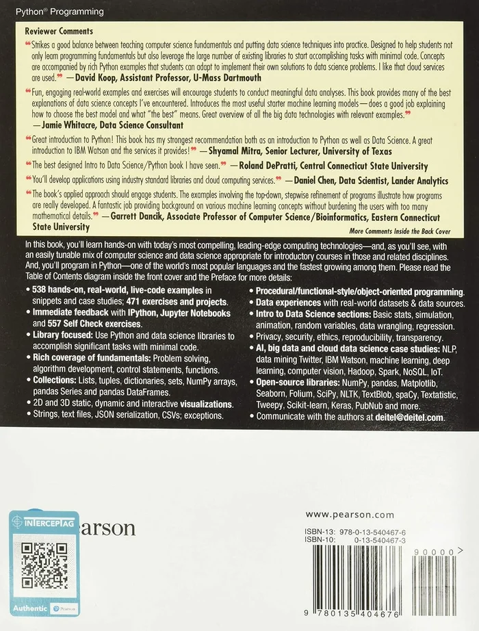offers a unique approach to teaching introductory Python programming, appropriate for both computer-science and data-science audiences. Providing the most current coverage of topics and applications, the book is paired with extensive traditional supplements as well as Jupyter Notebooks supplements. Real-world datasets and artificial-intelligence technologies allow students to work on projects making a difference in business, industry, government and academia. Hundreds of examples, exercises, projects (EEPs), and implementation case studies give students an engaging, challenging and entertaining introduction to Python programming and hands-on data science.