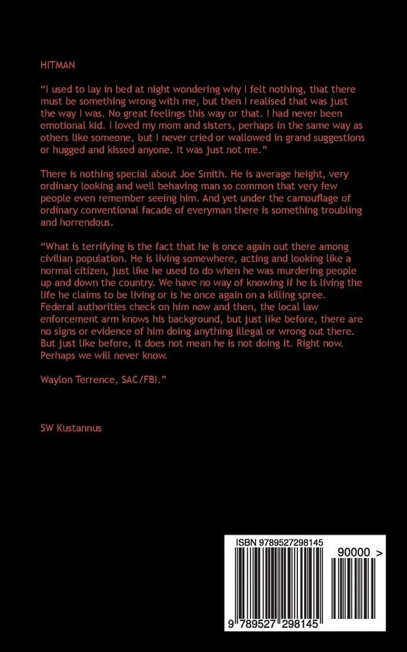 HITMAN “I used to lay in bed at night wondering why I felt nothing, that there must be something wrong with me, but then I realised that was just the way I was. No great feelings this way or that. I had never been emotional kid. I loved my mom and sisters, perhaps in the same way as others like someone, but I never cried or wallowed in grand suggestions or hugged and kissed anyone. It was just not me.” There is nothing special about Joe Smith. He is average height, very ordinary looking and well behaving man so common that very few people even remember seeing him. And yet under the camouflage of ordinary conventional facade of everyman there is something troubling and horrendous. “What is terrifying is the fact that he is once again out there among civilian population. He is living somewhere, acting and looking like a normal citizen, just like he used to do when he was murdering people up and down the country. We have no way of knowing if he is living the life he claims to be living or is he once again on a killing spree. Federal authorities check on him now and then, the local law enforcement arm knows his background, but just like before, there are no signs or evidence of him doing anything illegal or wrong out there. But just like before, it does not mean he is not doing it. Right now. Perhaps we will never know. Waylon Terrence, SAC/FBI.” SW Kustannus