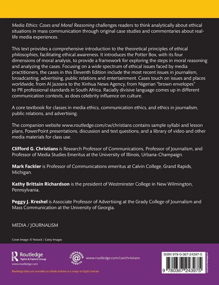 This text provides a comprehensive introduction to the theoretical principles of ethical philosophies, facilitating ethical awareness. It introduces the Potter Box, with its four dimensions of moral analysis, to provide a framework for exploring the steps in moral reasoning and analyzing the cases. Focusing on a wide spectrum of ethical issues faced by media practitioners, the cases in this Eleventh Edition include the most recent issues in journalism, broadcasting, advertising, public relations and entertainment. Cases touch on issues and places worldwide, from Al Jazeera to the Xinhua News Agency, from Nigerian “brown envelopes” to PR professional standards in South Africa. Racially divisive language comes up in different communication contexts, as does celebrity influence on culture.