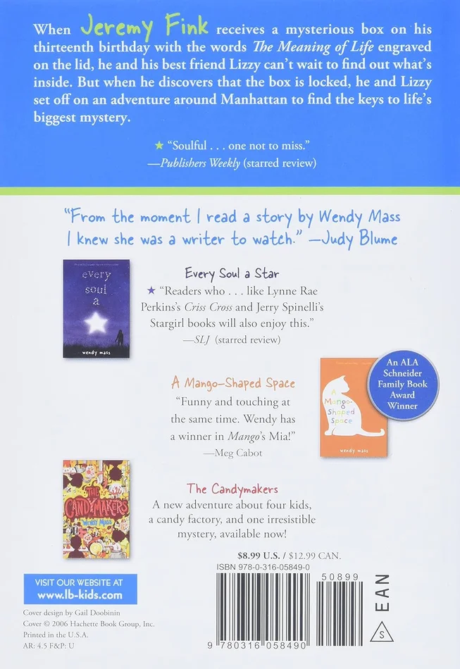 Jeremy’s summer takes an unexpected turn when a mysterious wooden box arrives in the mail. According to the writing on the box, it holds the meaning of life! Jeremy is supposed to open it on his thirteenth birthday. The problem is, the keys are missing, and the box is made so that only the keys will open it without destroying what’s inside. Jeremy and Lizzy set off to find the keys, but when one of their efforts goes very wrong, Jeremy starts to lose hope that he’ll ever be able to open the box. But he soon discovers that when you’re meeting people named Oswald Oswald and using a private limo to deliver unusual objects to strangers all over the city, there might be other ways of finding out the meaning of life.