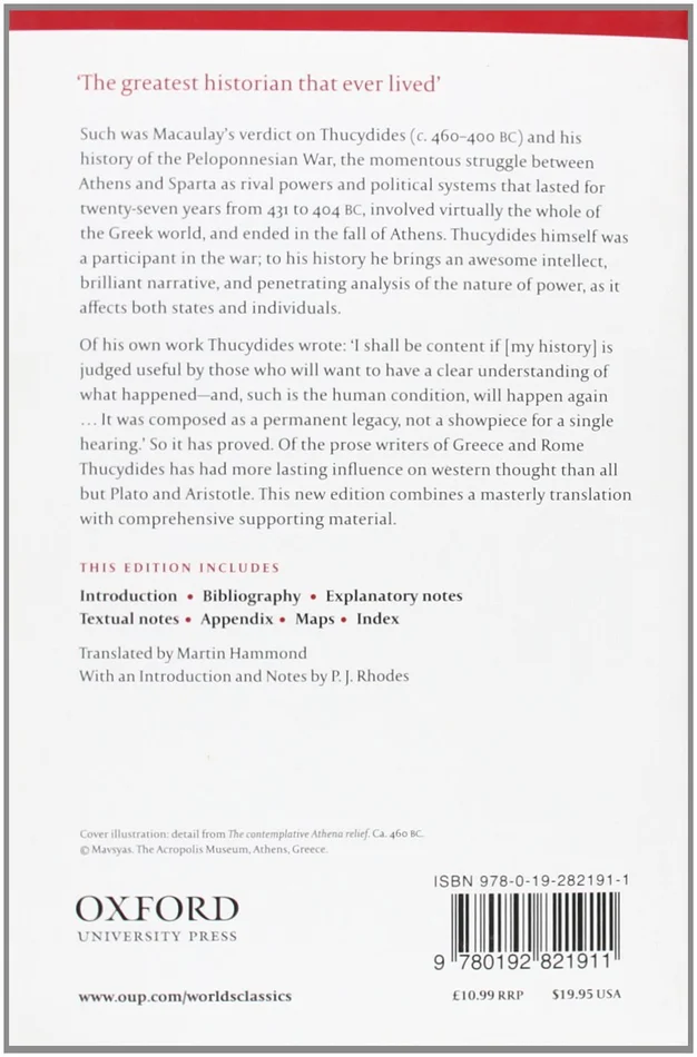 “The greatest historian that ever lived.” Such was Macaulay’s assessment of Thucydides (c. 460 400 BC) and his history of the Peloponnesian War, the momentous struggle between Athens and Sparta that lasted for twenty seven years from 431 to 404 BC, involved virtually the whole of the Greek world, and ended in the fall of Athens. A participant in the war himself, Thucydides brings to his history an awesome intellect, brilliant narrative, and penetrating analysis of the nature of power, as it affects both states and individuals. Of the prose writers of the ancient world, Thucydides has had more lasting influence on western thought than all but Plato and Aristotle. This new edition combines a masterly new translation by Martin Hammond with comprehensive supporting material, including summaries of individual Books; textual notes; a comprehensive analytical index; an appendix on weights, measures and distances, money, and calendars; ten maps; an up to date bibliography; and an illuminating introduction by P.J. Rhodes.