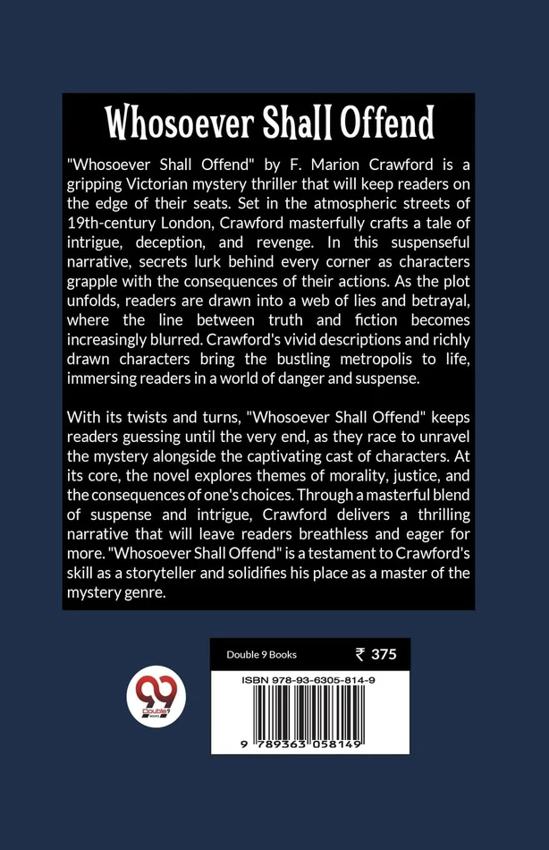 “Whosoever Shall Offend” by F. Marion Crawford is a gripping Victorian mystery thriller that will keep readers on the edge of their seats. Set in the atmospheric streets of 19th-century London, Crawford masterfully crafts a tale of intrigue, deception, and revenge. In this suspenseful narrative, secrets lurk behind every corner as characters grapple with the consequences of their actions. As the plot unfolds, readers are drawn into a web of lies and betrayal, where the line between truth and fiction becomes increasingly blurred. Crawford’s vivid descriptions and richly drawn characters bring the bustling metropolis to life, immersing readers in a world of danger and suspense. With its twists and turns, “Whosoever Shall Offend” keeps readers guessing until the very end, as they race to unravel the mystery alongside the captivating cast of characters. At its core, the novel explores themes of morality, justice, and the consequences of one’s choices. Through a masterful blend of suspense and intrigue, Crawford delivers a thrilling narrative that will leave readers breathless and eager for more. “Whosoever Shall Offend” is a testament to Crawford’s skill as a storyteller and solidifies his place as a master of the mystery genre.