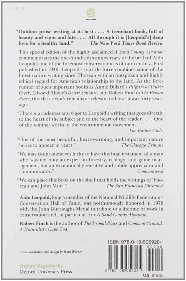 The volume includes a section on the monthly changes of the Wisconsin countryside; another section that gathers together the informal pieces written by Leopold over a forty-year period as he traveled around the woodlands of Wisconsin, Iowa, Arizona, Sonora, Oregon, Manitoba, and elsewhere; and a final section in which Leopold addresses more formally the philosophical issues involved in wildlife conservation. As the forerunner of such important books as Annie Dillard’s