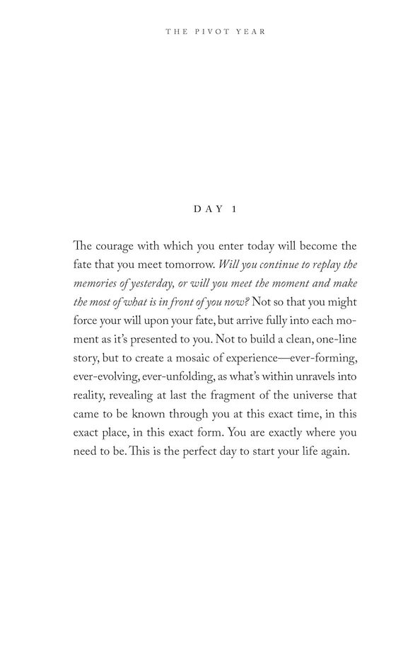 This is the year you change your life. There*s a saying that when the moment comes, you don*t need words on a page, you need new thoughts in your head. When the moment really comes when you have to find your courage, when you have to let go, when you don*t know what to do, you aren*t going to go to your book shelf to try to find the answer. You need it with you here and now. Devote the next twelve months of your life to making measured and real change, beginning with your mindset.