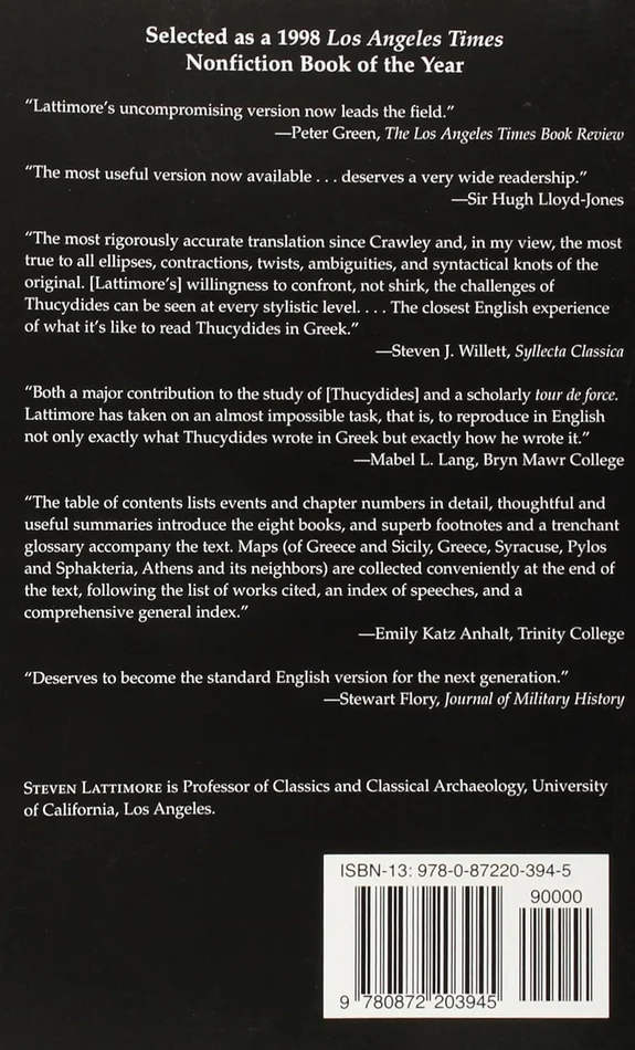The first unabridged translation into American English, and the first to take into account the wealth of Thucydidean scholarship of the last half of the twentieth century, Steven Lattimore*s translation sets a new standard for accuracy and reliability. Notes provide information necessary for a fuller understanding of problematic passages, explore their implications as well as the problems they may pose, and shed light on Thucydides as a distinctive literary artist as well as a source for historians and political theorists.