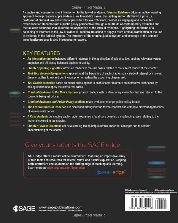 takes an active learning approach to help readers apply evidence law to real-life cases. Bestselling author Matthew Lippman, a professor of criminal law and criminal procedure for over 25 years, creates an engaging and accessible experience for students from a public policy perspective through a multitude of contemporary examples and factual case scenarios that illustrate the application of the law of evidence. Highlighting the theme of a balancing of interests in the law of evidence, readers are asked to apply a more critical examination of the use of evidence in the judicial system. The structure of the criminal justice system and coverage of the criminal investigative process is also introduced to readers.
