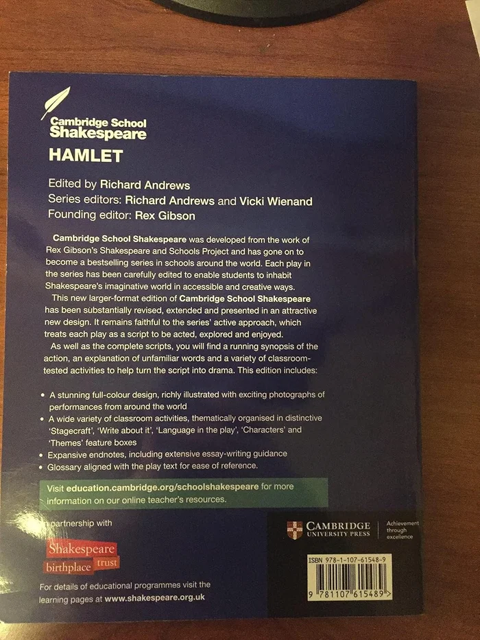 An improved, larger-format edition of the Cambridge School Shakespeare plays, extensively rewritten, expanded and produced in an attractive new design. An active approach to classroom Shakespeare enables students to inhabit Shakespeare’s imaginative world in accessible and creative ways. Students are encouraged to share Shakespeare’s love of language, interest in character and sense of theatre. Substantially revised and extended in full colour, classroom activities are thematically organised in distinctive ‘Stagecraft’, ‘Write about it’, ‘Language in the play’, ‘Characters’ and ‘Themes’ features. Extended glossaries are aligned with the play text for easy reference. Expanded endnotes include extensive essay-writing guidance for ‘Hamlet’ and Shakespeare. Includes rich, exciting colour photos of performances of ‘Hamlet’ from around the world.
