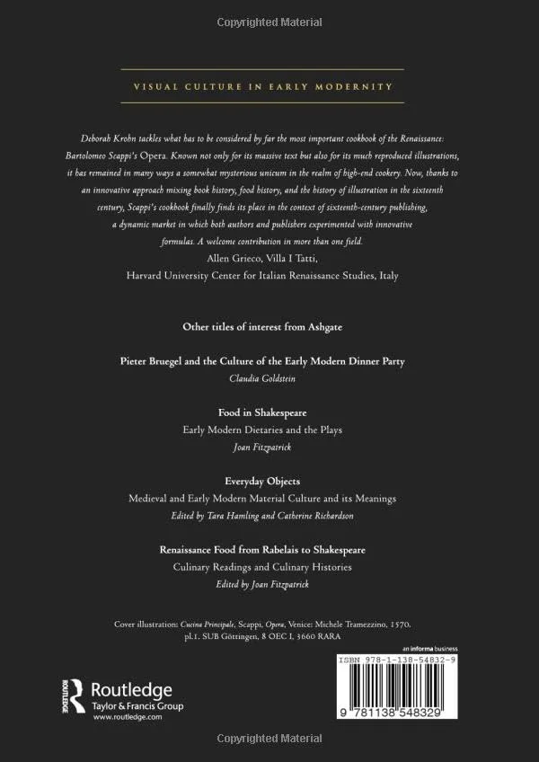 Though Bartolomeo Scappi’s Opera (1570), the first illustrated cookbook, is well known to historians of food, up to now there has been no study of its illustrations, unique in printed books through the early seventeenth century. In Food and Knowledge in Renaissance Italy, Krohn both treats the illustrations in Scappi’s cookbook as visual evidence for a lost material reality; and through the illustrations, including several newly-discovered hand-colored examples, connects Scappi’s Opera with other types of late Renaissance illustrated books. What emerges from both of these approaches is a new way of thinking about the place of cookbooks in the history of knowledge. Krohn argues that with the increasing professionalization of many skills and trades, Scappi was at the vanguard of a new way of looking not just at the kitchen-as workshop or laboratory-but at the ways in which artisanal knowledge was visualized and disseminated by a range of craftsmen, from engineers to architects. The recipes in Scappi’s Opera belong on the one hand to a genre of cookery books, household manuals, and courtesy books that was well established by the middle of the sixteenth century, but the illustrations suggest connections to an entirely different and emergent world of knowledge. It is through study of the illustrations that these connections are discerned, explained, and interpreted. As one of the most important cookbooks for early modern Europe, the time is ripe for a focused study of Scappi’s Opera in the various contexts in which Krohn frames it: book history, antiquarianism, and visual studies.