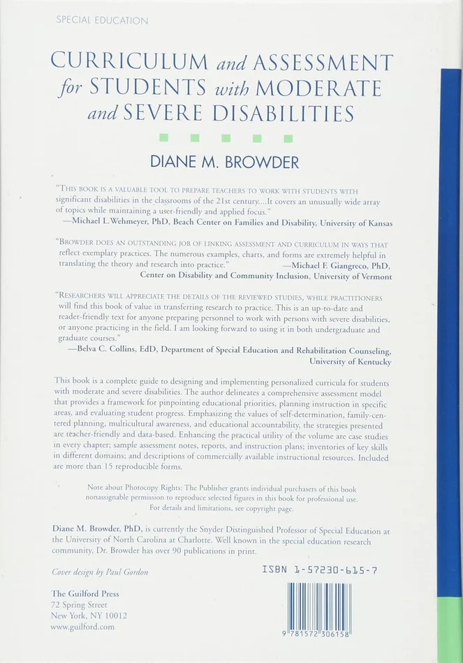 This timely volume provides a complete guide to designing and implementing personalized curricula for K-12 students with moderate and severe disabilities. The author delineates a comprehensive assessment model that provides a framework for pinpointing educational priorities, planning instruction in specific areas, and evaluating student progress. Emphasizing the values of self-determination, family-centered planning, multicultural awareness, and educational accountability, the strategies presented are teacher-friendly and data-based. Case studies in every chapter illustrate the educational needs and accomplishments of students with a variety of disabilities, including autism, mental retardation, severe behavior disorders, and multiple disabilities. Further enhancing the practical utility of the volume are sample assessment notes, reports, and instruction plans; inventories of key skills in different domains; and descriptions of commercially available instructional resources. Included are more than 15 reproducible forms. An ideal undergraduate or graduate-level text, this is also an invaluable resource for teachers, school psychologists, and other special education professionals.