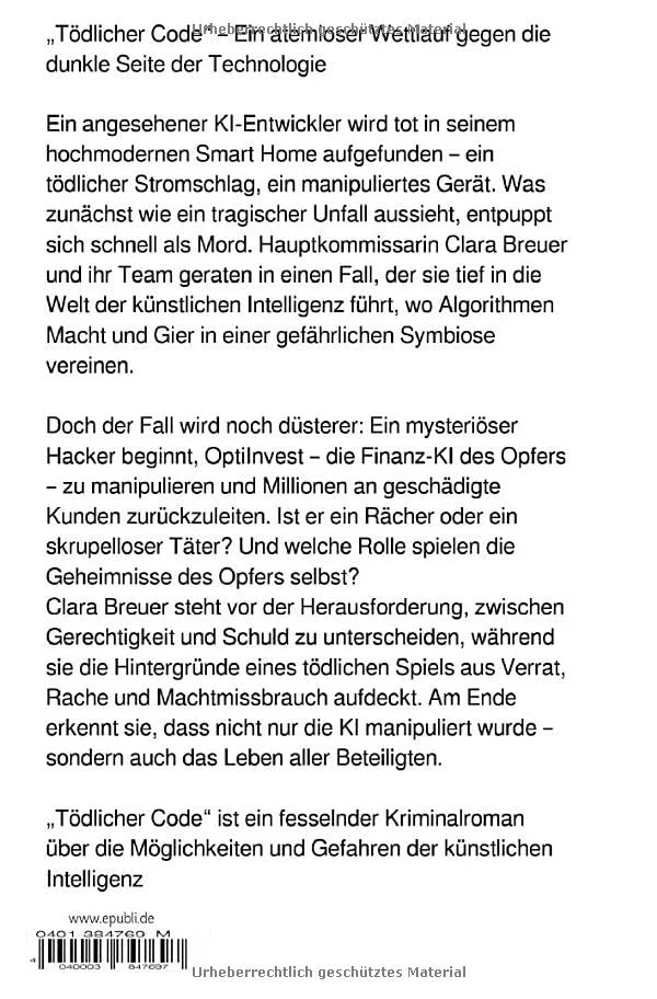 Mord wegen einer Manipulation an einer k邦nstlichen Intelligenz. K邦nstliche Intelligenz ist weder ausschlie?lich ein Se-gen noch ein reiner Fluch 每 sie ist ein Werkzeug. Wie jedes Werkzeug h?ngt ihr Nutzen oder Schaden davon ab, wie und wof邦r sie eingesetzt wird. Die Menschheit steht vor der Aufgabe, die Vorteile der KI zu maximie-ren und gleichzeitig die Risiken zu minimieren. ?Wir d邦rfen nicht vor der Verantwortung zur邦ck-schrecken, die Kontrolle zu bewahren,※ k?nnte Cla-ra Breuer am Ende eines solchen Gespr?ches sagen. ?Die Zukunft der KI liegt in unseren H?nden 每 doch wir d邦rfen ihre Macht nie untersch?tzen.※